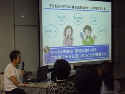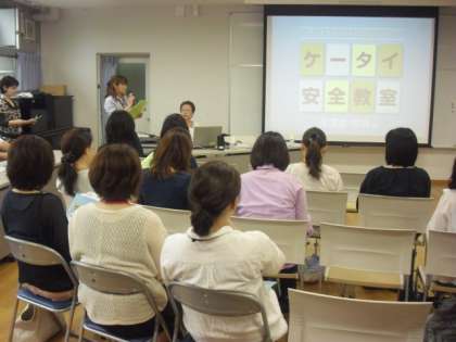 PTA文化厚生部主催による、第1回家庭教育学級「子供をトラブルから守るための携帯安全教室」が開かれました。講師は、NTT DOCOMOからお招きした中静先生です。