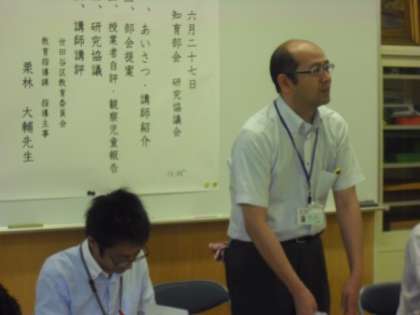 研究協議会では、よりよい授業をつくるために、先生方から活発に意見が出されました。そして、栗林先生から、今日の授業についてと、社会科の指導について、ご指導いただきました。子どもたちが活発に話し合っていたことを高く評価していただきました。ご指導いただいたことを、今後の授業づくりに活かしていきます。