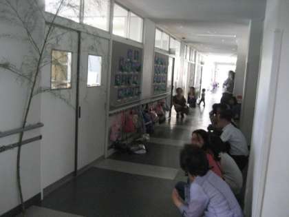 保護者の方もアナウンスに従って廊下で身体を丸めてしゃがんで