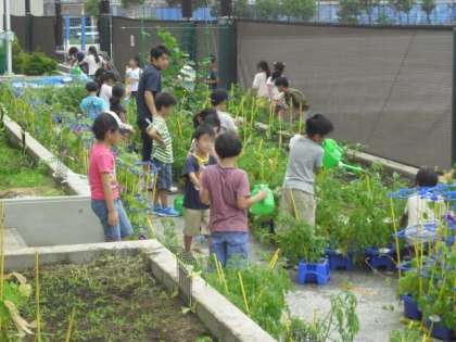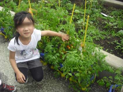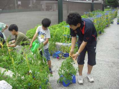 2年生のミニトマトが、しっかりと成長しています。すでに実がたくさんついています。中には、きれいな赤に染まり、食べごろをむかえていそうなものもあります。夏休み中も、たくさん収穫できると思います。どんな料理に使えるか、おうちの方と相談して、料理に挑戦するのもいいでしょう。