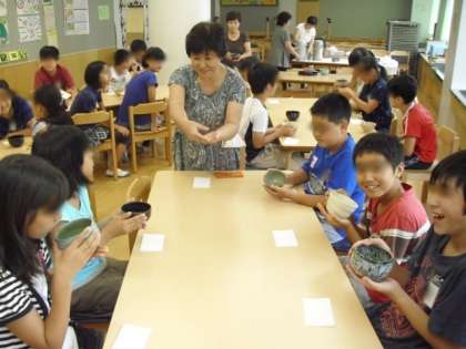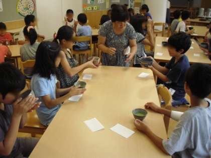 7月8日(月)に引き続き、社会科の歴史学習の一環として、地域の「東深沢・等々力コミュニティー」の4人の方々に教えていただきながら、室町時代から続く茶の湯を体験しました。