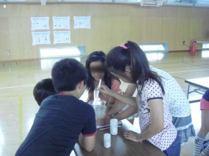 次に、東京都の浄水場で行っている水をきれいにする過程の一部をグループごとに実験させてもらいました。濁った水に凝集剤を入れてかくはんし、処理をすると水がきれいになります。汚れが固まり、底のほうに沈んでいく様子を見ている子どもたちからは歓声が上がりました。
