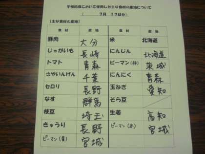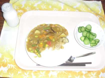 1学期最後の給食は、夏野菜のカレーライスです。食材に「そら豆」を使う予定でしたが、給食に適したものがありませんでしたので、本日は「そら豆」は使いませんでした。