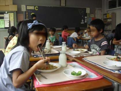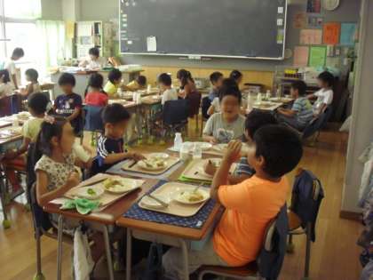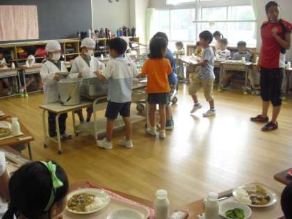 1学期最後の給食です。1年生も配膳がとても上手になりました。食欲も旺盛、大きな口を開けてモリモリ食べていました。