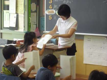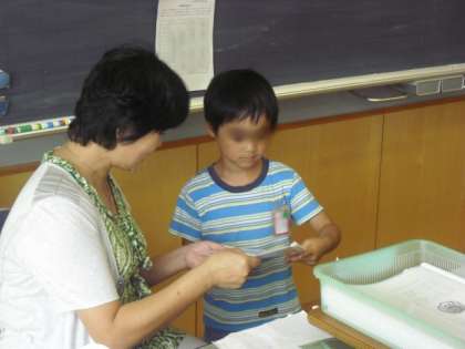 先生方が、子どもたちの1学期の活躍をまとめた通知表。1年生にとっては初めて渡されるものです。担任の先生から、一言とがんばり賞を添えてもらいながら通知表をいただきました。先生方の思いがたくさん詰まっています。4クラス分の写真がとれなくてごめんなさい。