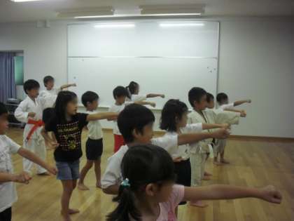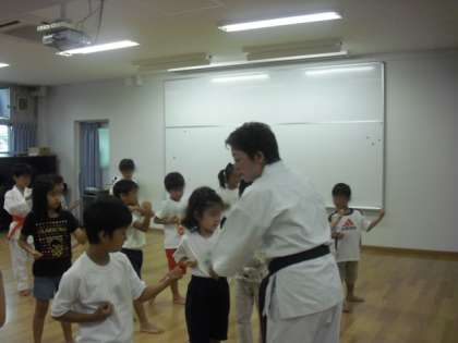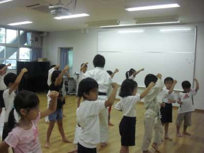 3年生以上はこれに加えて、組み手に挑戦しました。相手の突いてきた手を中段受けで払い、さらに突くという型で、カッコよく決まっていました。