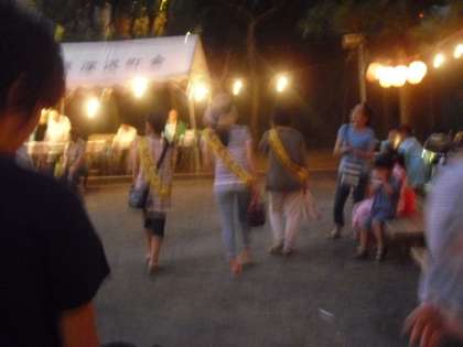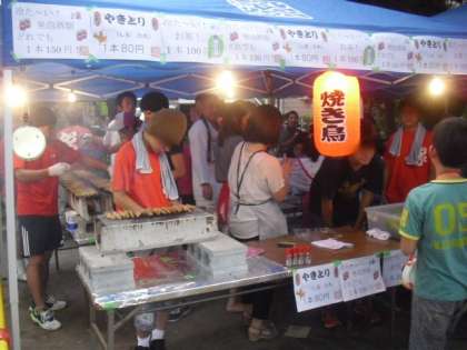 盆踊りの太鼓と鉦が鳴り響く中、おやじの会の、大人気焼き鳥店も出ています。ここでも中学生の先輩ががんばっています。そして、先生方もいつもお世話になっている町会やおやじの会の皆さんに対して感謝の気持ちを込めてお店を手伝っています。PTAの方々もがんばってくださっています。さらに、パトロールもしてくださっています。
