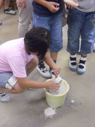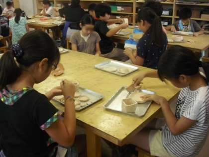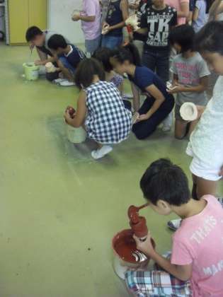 先週作り、素焼きしたお皿に、今日は、釉薬をつけました。釉薬には3種類あり、焼き上がると、それぞれ色が違います。