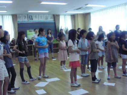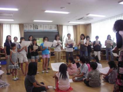 発声練習や歌う時の姿勢など指導していただき、ゴスペルに初めて挑戦する子どもも多く参加していました。今回は「Oh Happy day」の曲に挑戦してみました。