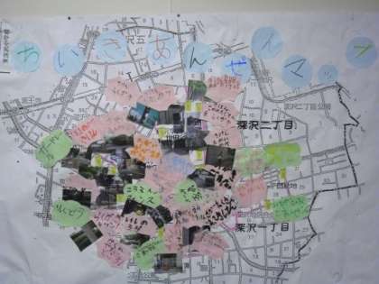 フィールドワークで安全な場所、危険な場所の写真を撮ったり、メモをしたりしました。そして、学校に戻ってきてから、大きな地図に写真や言葉をはりつけていきました。
