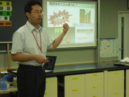 昨日、「富士通」の方々にいらしていただき、実験教室を開きました。テーマは「省エネ・節電」です。