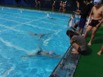 今日で、夏休み中に行ってきた18日間の水泳教室が終了です。最後の日ですから、自分の泳力を確認する「検定」を行いました。1秒に喜びを表す子や悔しい思いをする子とさまざまですが、みんなよく頑張りました。検定に合格して帽子に線を記入してもらい大喜びです。夏休み中の水泳が無事に終えたことに感謝です。ありがとうございました。