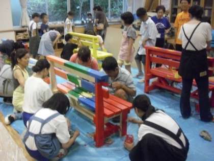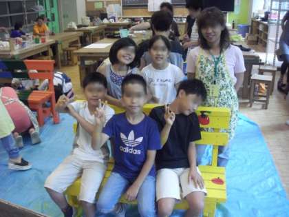早めに仕上がった、東深沢小学校の2つのうちの1つのグループは、自分たちが作ったベンチに座ってにっこり。