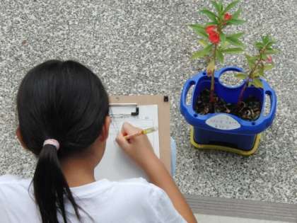 3年生は、ホウセンカを育てています。この観察も夏休みの宿題です。夏休み中に2回観察にすることになっています。プールの後に観察をする子が多いようです。