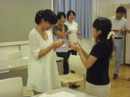 カードの示し方や、ラッキーセブン(2人組で7を作るゲーム)、紙に書かれたものは誰が好きなものかを当てるゲームなど、どれも、外国語活動や英語活動の指導に活用できるものでした。