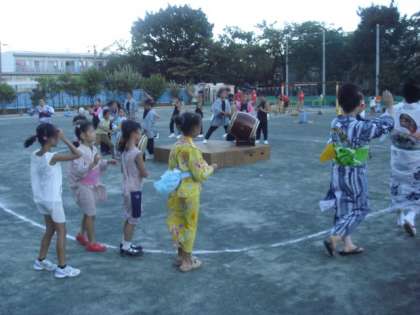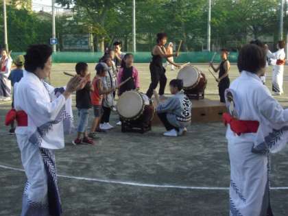 盆踊りには、地域の方々が参加してくださり、教えてくださっていました。ありがとうございました。東京音頭や炭坑節など、ワークショップで練習したお友達と、こざくらのお友達が和太鼓をたたきました。