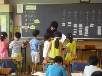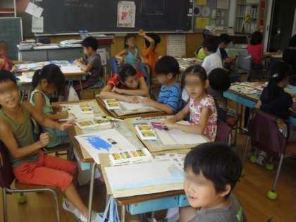 2学期の生活が始まりました。1年生は、夏休みのすばらしい思い出をお友達と話しながら絵に表わしていました。