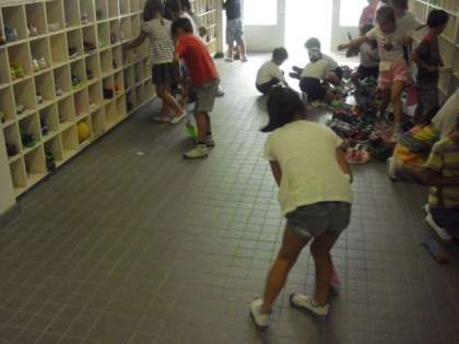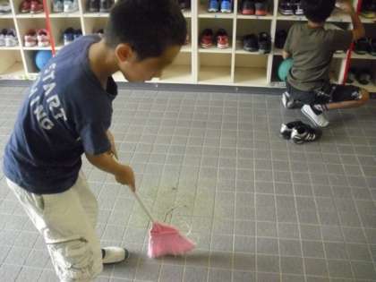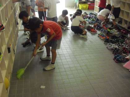 靴箱付近の掃除当番の4年生が、とても上手に床の砂埃を集めていました。