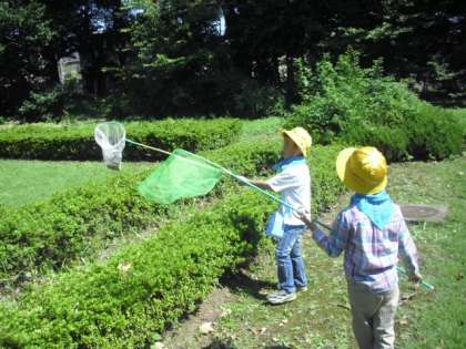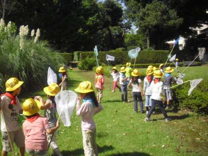 どの子も夢中になって、蝶々を追いかけたり、葉の裏側をのぞいたりして生き物を探していました。また、採った虫を友達と見せあう姿、一匹も採れなかった子にあげるなど友達との関わりも見られました。