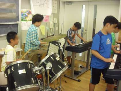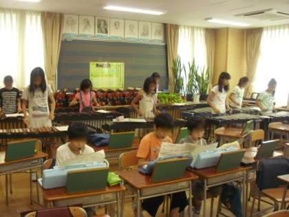 6年生は音楽の学習で、クラスごとに曲を選んで演奏の練習をしています。使っている楽器も多彩です。