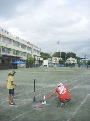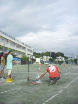 いよいよ完成したペットボトルロケットを飛ばします。何メートルくらい飛ぶのでしょうか?みんな、期待に胸を膨らませて、カウントダウンをします。