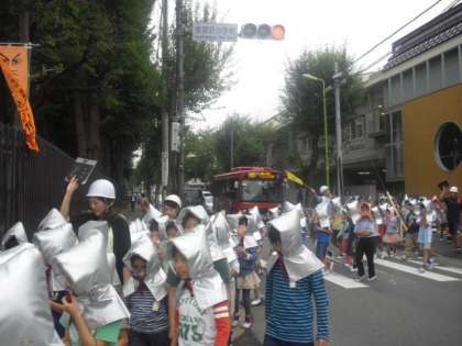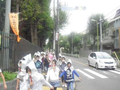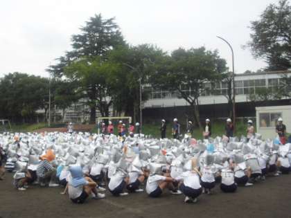 大きな地震が発生した後、近隣で火災が発生した想定で、お隣の学芸大学附属世田谷小学校の校庭へ避難しました。校舎から外に出て、道路を横断します。交通量もかなりありますが、学校主事さんの指示に従って整然と避難することができました。今日の避難の仕方は100点です。ひがしでは、毎月の避難訓練を「命を守る訓練」ととらえて、各学級や学年で指導しています。今日の訓練はその成果が出ていました。万一に備え、これからも真剣に訓練に取り組んでいきます。