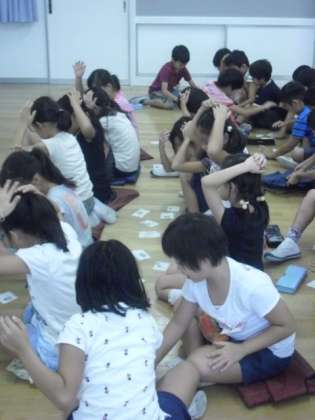 hamburger sushi pizza など、みんなが大好きな食べ物の発音を練習し、デーウィ先生の言葉を聞いてかるた形式で絵札をとるゲームをしました。