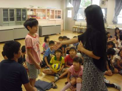 そして、「爆弾ゲーム」で、最後にボールを渡されたお友達が、デーウィ先生とあいさつの練習をしました。
