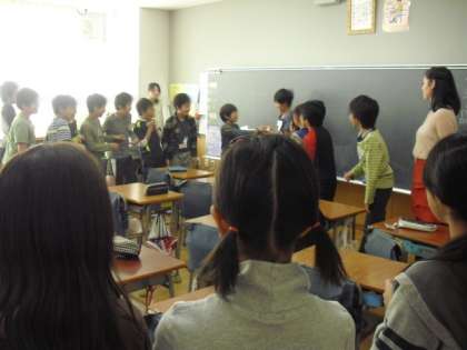 5年生は、担任の先生とALT(アシスタント ランゲージ ティーチャー)のエマ先生と一緒に外国語活動の学習をしました。
