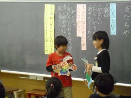 3年生は、道徳「友だちや」を学習しました。このお話を知っている子どももいましたが、初めて見る手作りのパネルシアターの世界に引き込まれて行きました。