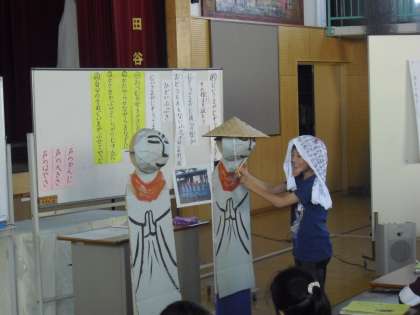 先生方が作ったお地蔵様に、実際にかさや手ぬぐいをかぶせる動作をしながら、じいさまの気持ちを考え、それを音読に生かしました。学習を通して、とても音読が上手になりました。
