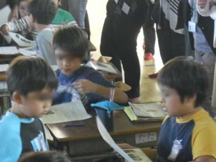 国語は「かさこじぞう」です。先生方が、100人以上集まるため、体育館で学習を行いました。子どもたちは、慣れない場所での学習の上、多くの先生方に囲まれ緊張したことと思いますが、集中して取り組んでいました。