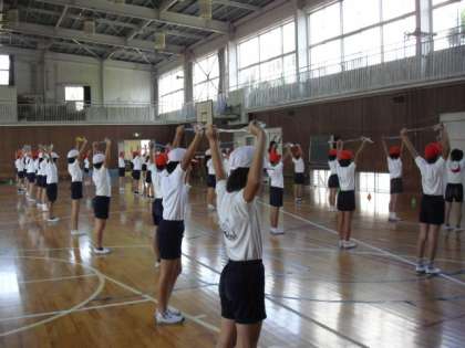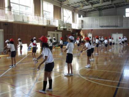 体育館で4年生が運動会の練習です。