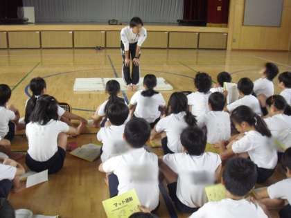 子どもたちは、4年生の先生が作ったマット運動の資料集をもとに、めあてを決め、互いに教え合いながら運動に取り組んでいます。中学校の先生方も、体育の専門家として子どもたちにアドバイスをしてくださっています。そのため、子どもたちの技能もどんどん伸びています。子どもたちにたくさん笑顔が見られるのはうれしいことです。中学校の先生方、ありがとうございます。