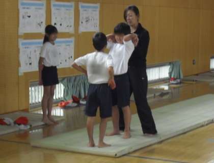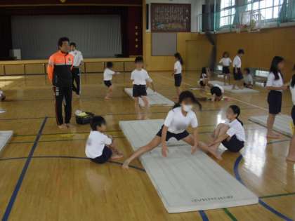 東深沢中学校の保健体育の先生お2人が、ひがしにいらして、担任の先生と一緒に4年生のマット運動を指導してくださっています。
