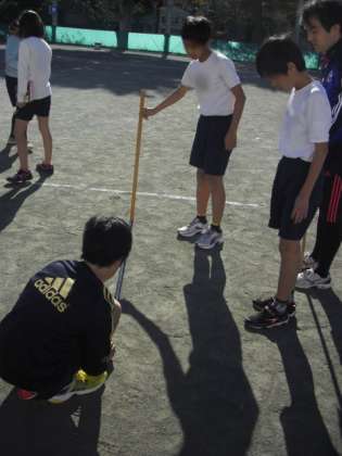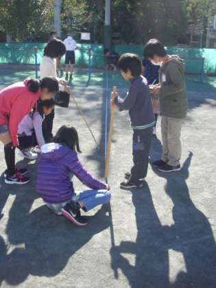 1mものさしとその影の長さを基にして、柱の影の長さを測り、計算すればおよその高さが得られます。