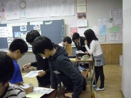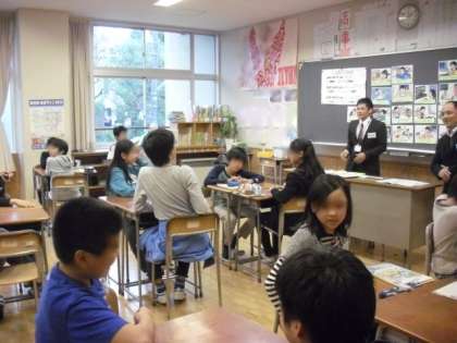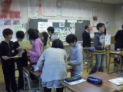 教室の中を自由に動いて、お友達同士で起きる時刻や寝る時刻などの生活の時刻を尋ねたり答えたりしました。中学校の英語の先生も指導しました。お友達同士で積極的に尋ね合いながら楽しく活動することができました。