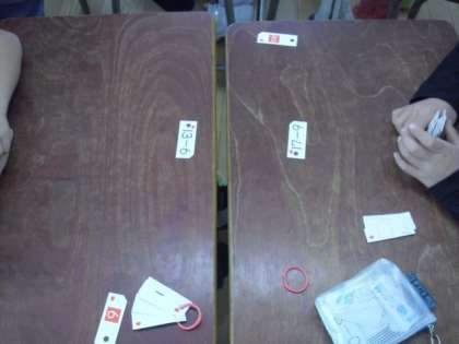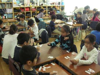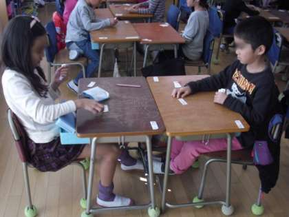 お友達と2人でカードを出し合い、答えが大きい方が勝ちです。みんな楽しく遊びながらも計算に集中していました。1年生の繰り下がりのひき算は、これからの様々な計算の大切な基礎です。繰り返し計算の練習をしていきます。