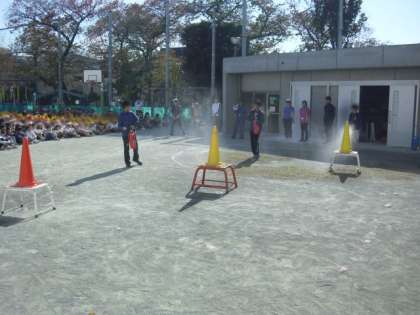 また、消火器の使用方法についても、指導していただきました。子どもたちを代表して、6年生から3名のお友達も実際に消火器の使用訓練をしました。手順に従って上手に使うことができました。