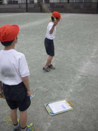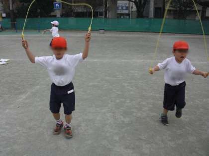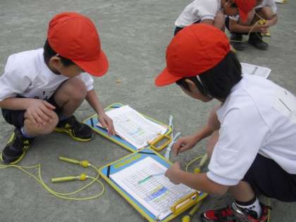 1年生が、体育で短なわとびを練習していました。お友達同士で挑戦する技を確かめ、跳んだ回数を数えていました。