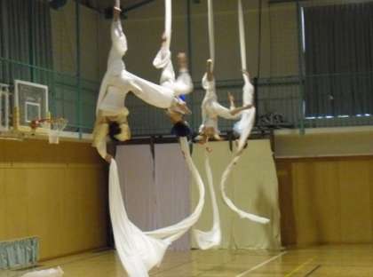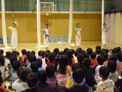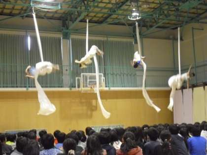 羽があるかのように布を昇ったり、回転したり、逆さまになったりしながら柔軟に舞うさまに、子どもたちも先生方も思わず歓声を上げたり、息を飲んだりしてしまいました。