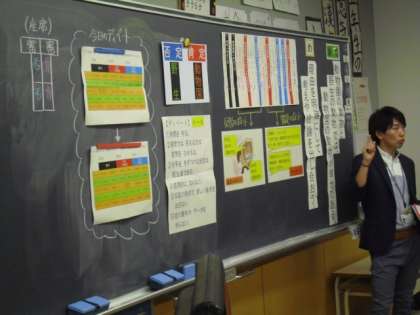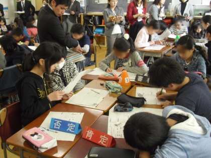 国語の「ディベート」を通して話し合いをする研究授業を行いました。「ディベート」とは、論題(テーマ)に対し、「肯定側」「否定側」「審判」の立場に立って意見を伝え合い、互いの考えを深めていくものです。