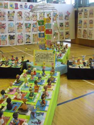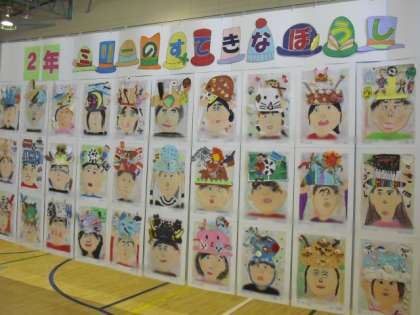 2年生の平面作品「ミリーのすてきなぼうし」、立体作品「おしゃれな なかまたち」