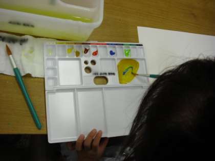 図工室に入ってみると、真新しいパレットに絵の具を入れて、真新しい筆が絵の具の色に染まっていました。今日は、初めて「絵の具」を使う日です。