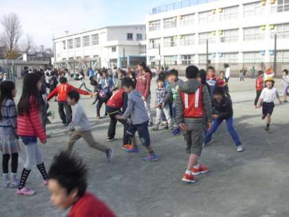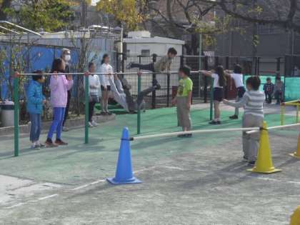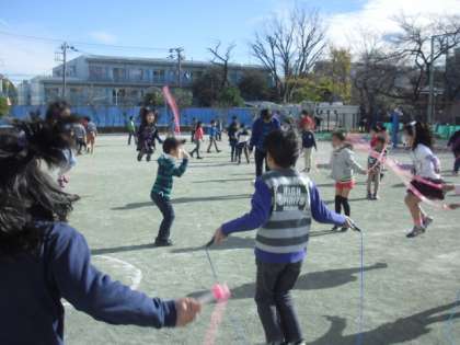 遊びは、鬼ごっこや、固定遊具施設、昔遊び、なわとびなど様々です。子どもたちは、各自が選んだ場所で元気いっぱい遊んでいました。