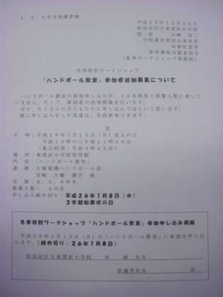 1月13日(月)成人の日に、冬季特別ワークショップ「ハンドボール教室」を行います。参加申し込みが少ないので追加募集をします。
