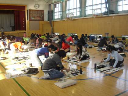 今日は、書き初め大会(5年)を体育館で行いました。