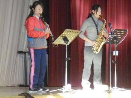 音楽朝会の幕開けは、クラリネットとアルトサクソフォーンの紹介からでした。