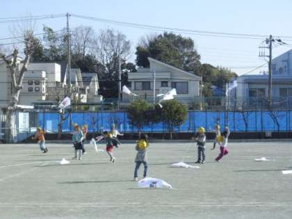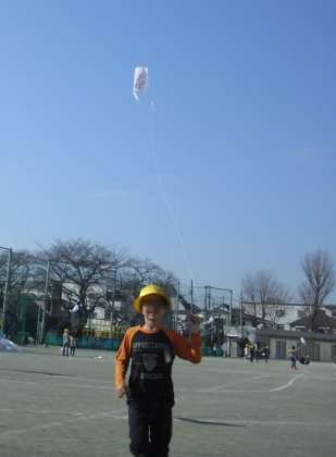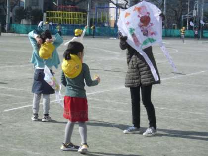 1年生のお友達が、凧を揚げようと元気いっぱいに校庭を走り回っています。思い思いの絵が描かれている凧が、気持ちよさそうに青空を舞っています。