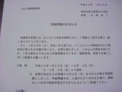 1/28 学級閉鎖(1年2組・1年4組・5年3組)のお知らせ
